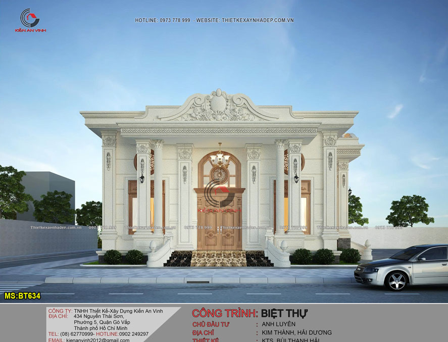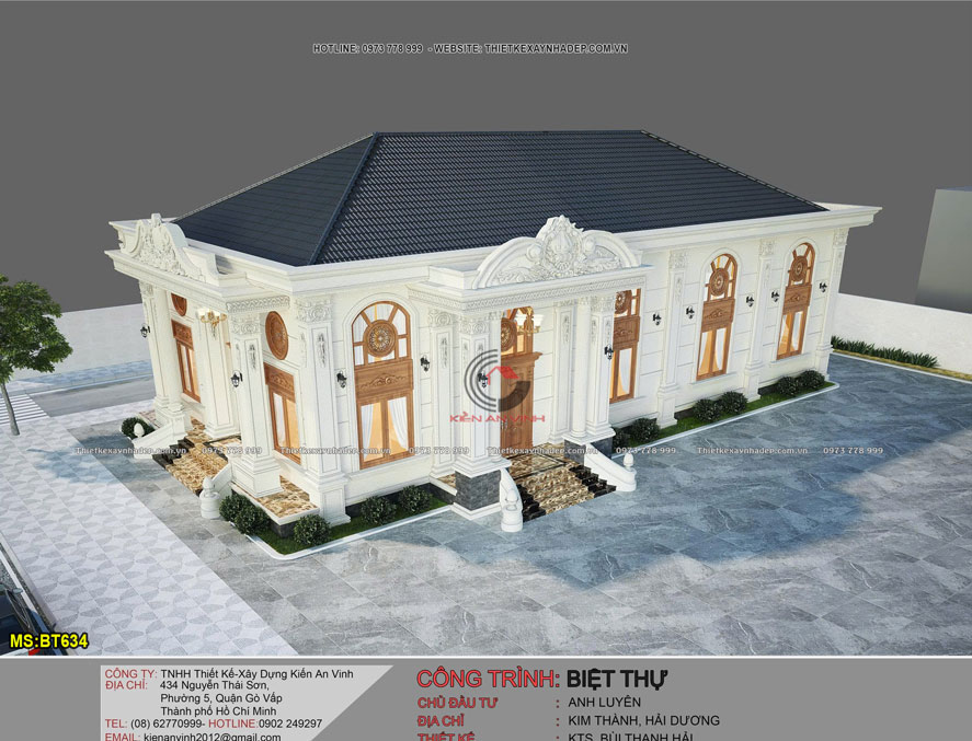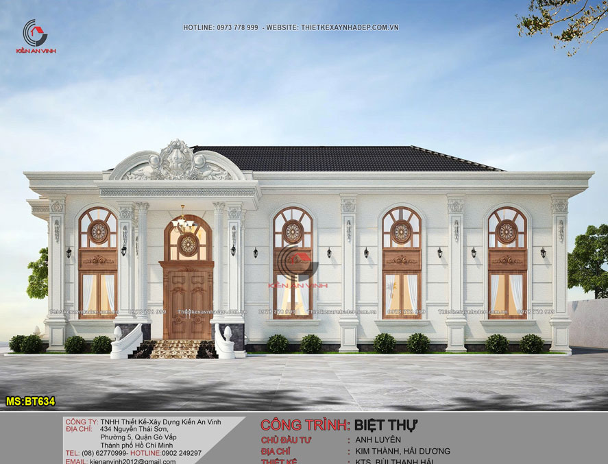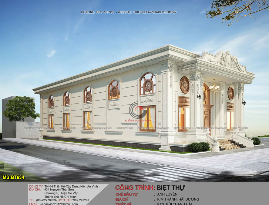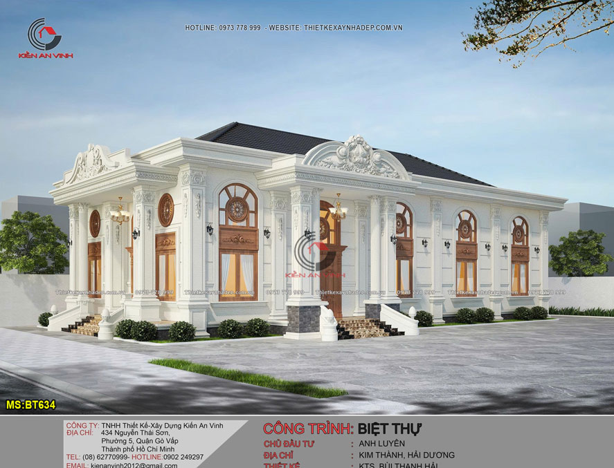 Phương án thiết kế biệt thự 1 tầng có lửng tân cổ điển - BT634 là lựa chọn của anh Luyên ở Hải Dương. Kiến trúc mang dấu ấn riêng biệt và đầy cuốn hút. Dù không sở hữu chiều cao đồ sộ như những công trình nhiều tầng. Nhưng mẫu nhà biệt thự đẹp này vẫn tạo được ấn tượng sâu sắc.