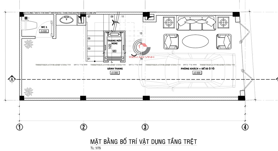 Tầng trệt: Phòng khách, khu để ô tô, 1 WC, khu vực thang bộ và thang máy