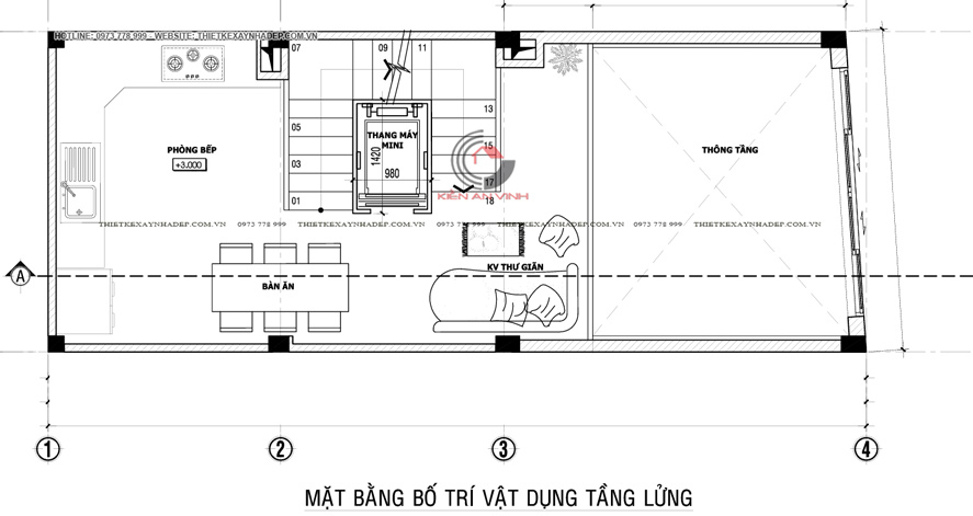 Tầng lửng: Khu bếp, bàn ăn, không gian thư giãn