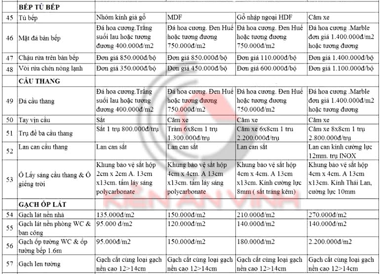 Cùng tham khảo Bảng giá xây dựng nhà trọn gói của công ty Kiến An Vinh như sau: