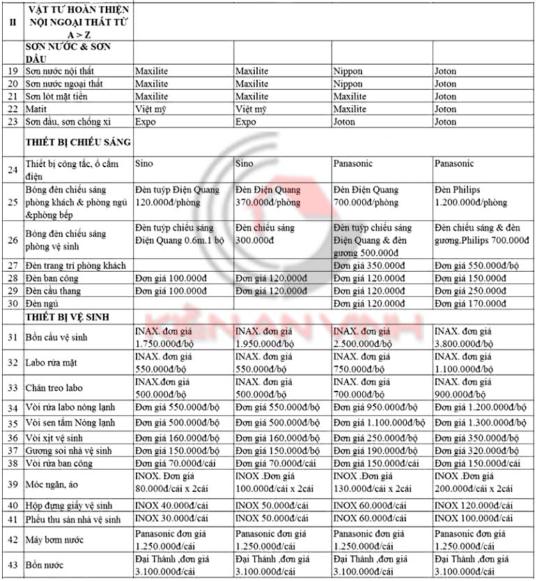 Vật tư hoàn thiện Biệt Thự ( Mức Khá ) |