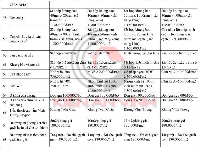 Đơn giá trên có thể tăng giảm tùy theo Quận, Huyện thi công |