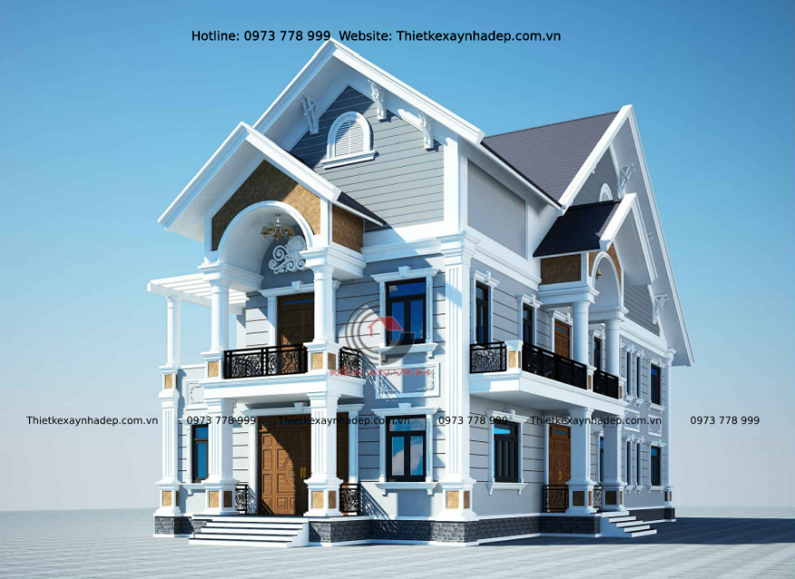 Màu sắc phối sang trọng, sự kết hợp giữa các màu như trắng, xám và gạch vàng ốp có đường vân. Giúp cho việc tạo nét đẹp đặc trưng cho mẫu biệt thự 2 tầng hiện đại mái thái càng thêm cuốn hút và đa dạng màu sắc hơn. Tránh cảm giác nhàm chán do sử dụng xuyên suốt 1 màu. Hệ mái thái màu ghi còn làm tôn lên nét đẹp sang trọng và bắt mắt cho kiến trúc. Tạo sự riêng biệt để lại ấn tượng tốt trong lòng người xem.