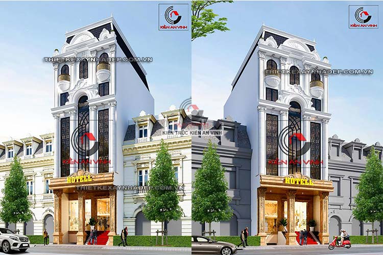 Mẫu thiết kế khách sạn 2 mặt tiền phong cách tân cổ điển đẹp sang trọng. Phù hợp cho...